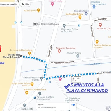 Arriendo de departamento turístico ubicado en un excelente barrio central de Reñaca, Viña del Mar, a solo 5 minutos caminando de la playa. Olvídate del auto: estarás a pasos de supermercados como Líder y Santa Isabel, bancos, pubs, restaurantes y farmacias. Además, cuenta con excelente conectividad y locomoción cercana, ideal para disfrutar al máximo todo lo que Reñaca tiene para ofrecer.